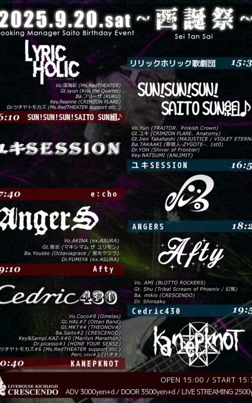 開催日:2025年9月20日(土) 会場:吉祥寺クレッシェンド <出演> リリックホリック歌劇団 / SUN!SUN !SUN!SAITO SUN組 / ユキSESSION / e:cho / ANGERS […]
