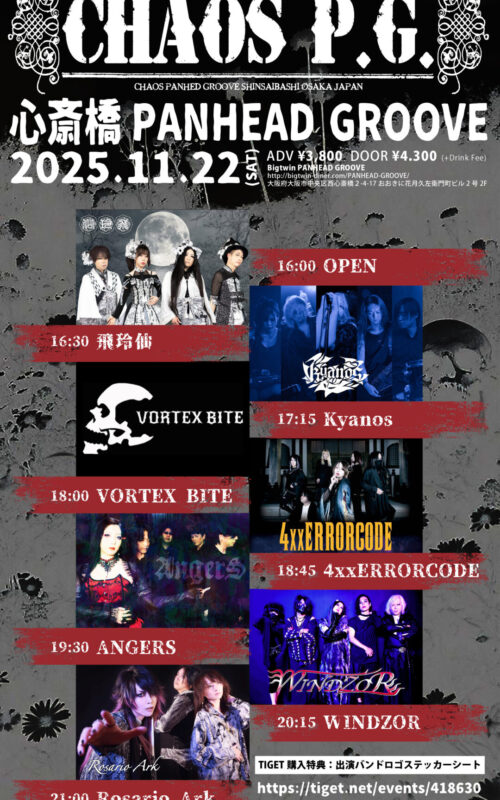 開催日:2025年11月22日(土) 会場:大阪心斎橋PANHED GROOVE <出演> 4xxERRORCODE / ANGERS / 飛玲仙 / Kyanos / Rosario Ark / VORTE […]